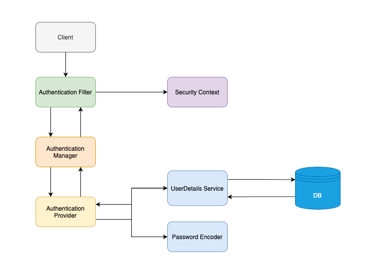 4. The Authentication Provider will, in turn, make use of a UserDetailsService and a PasswordEncoder, to query the database for a user by username and match its password.