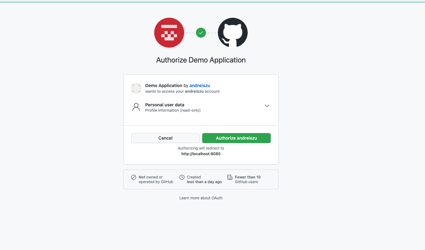 If you now go into your browser at localhost:8080/hello, you should be redirected to the GitHub login form. After providing correct credentials of your account, you will be prompted to authorize the browser to access your backend application.